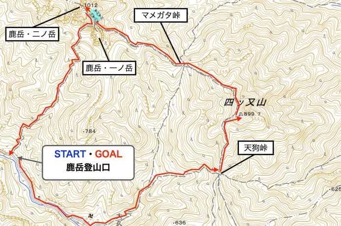マメガタ峠から登り返し、鹿岳・一ノ岳はロープを頼りに北側をトラバースします。鹿岳のコルから木製のハシゴと鎖場を経て、最高峰の鹿岳・二ノ岳へ。鹿岳のコルから滑りやすいジグザグの斜面を下り、針葉樹林帯を進むと鹿岳登山口に戻ります。