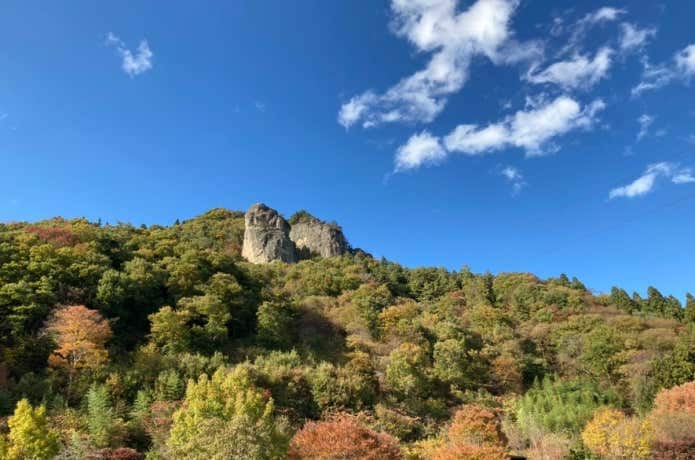 戦国時代に真田氏の山城が置かれていた岩櫃山(いわびつやま)。高さ200メートルほどの岩壁は、天然の要害として、武田の三堅城の1つに数えられていました。