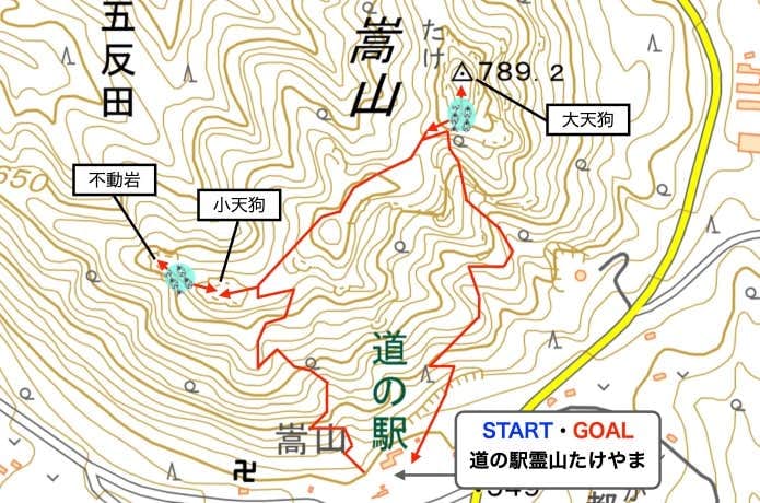 道の駅霊山たけやま(45分)→小天狗(5分)→不動岩(6分)→小天狗(25分)→大天狗・嵩山(29分)→道の駅霊山たけやま