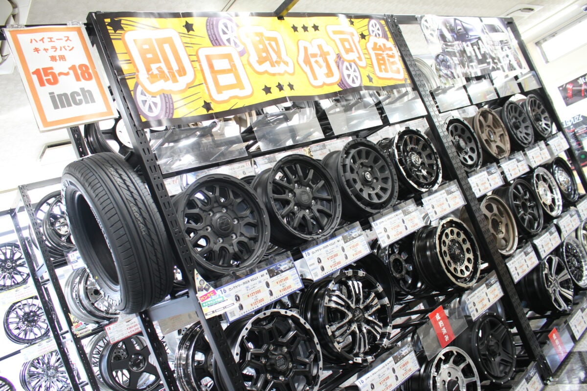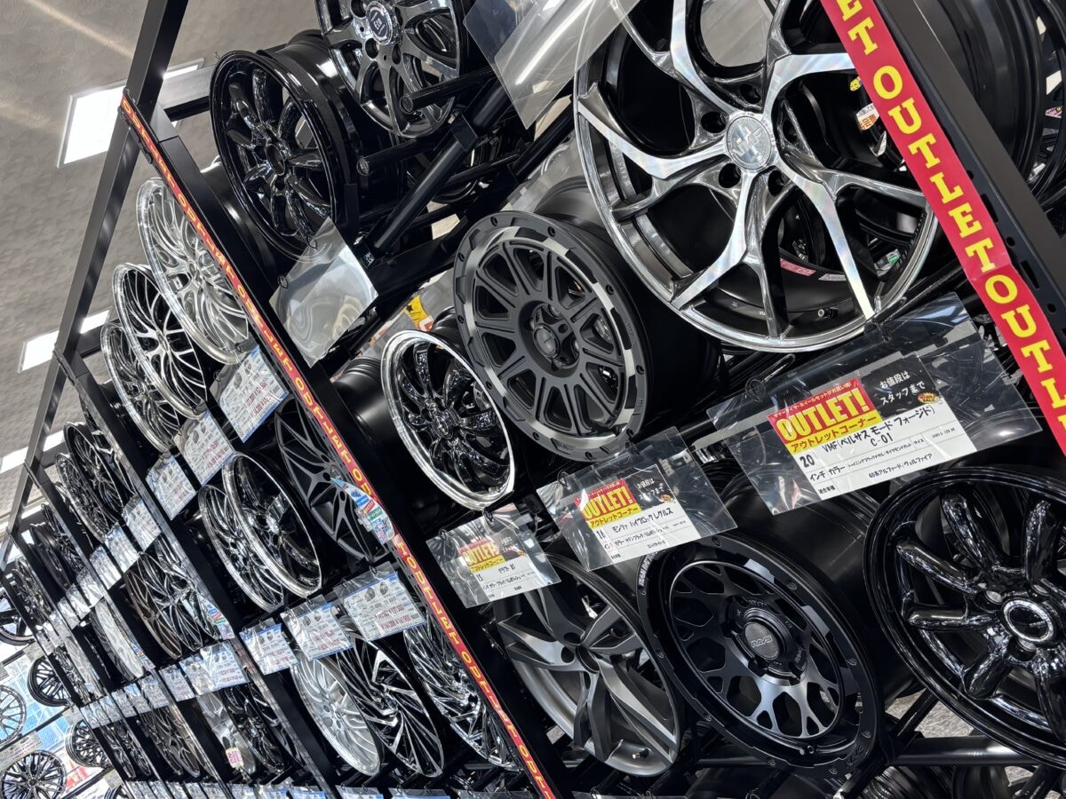 店内にはアウトレットホイールのコーナーもある。わずかなキズや塗装ムラはあるものの、気にならない人ならまさに掘り出しモノ。もちろんリーズナブルに購入できるため「少しでも安く買いたい」というユーザーに好評だ。