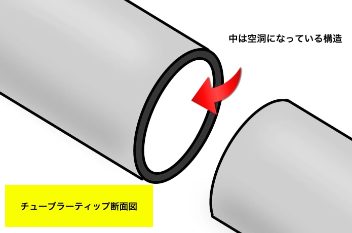 チューブラーティップは穂先が中空になっている構造で、根元から先端まで繋ぎ目がなく、軽くて反響感度が良いのが特徴です。