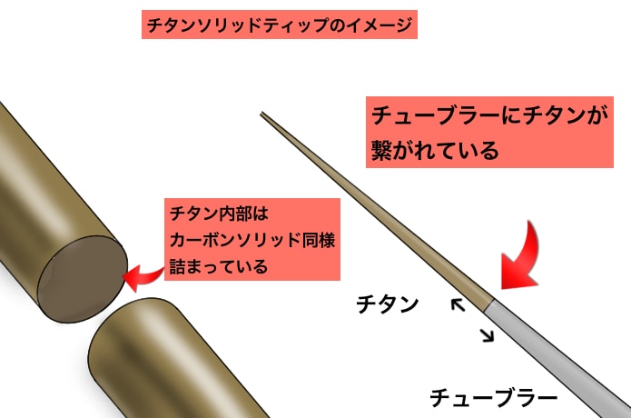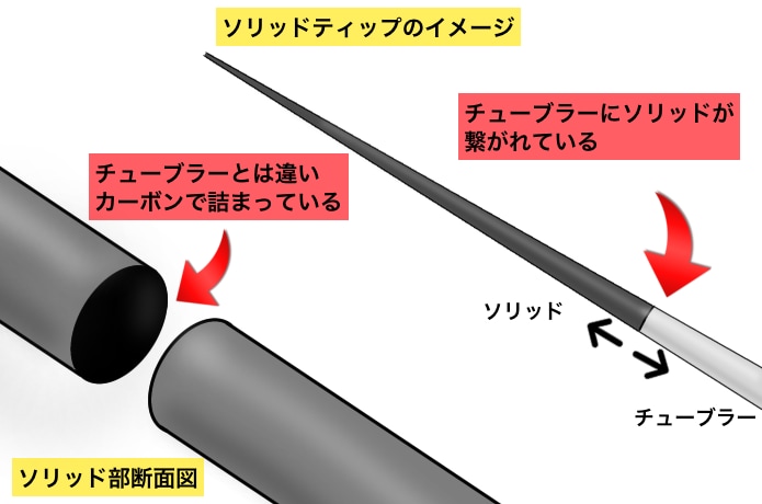 穂先の中身が詰まっているのがソリッドティップで、チューブラーのブランクの先端にソリッド素材を継ぎ足した構造になっています。