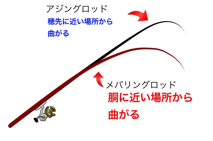 メバリングはルアーを巻いてアタリを乗せるのでスロー寄りのテーパー(胴調子)に、アジングはルアーをロッドで操作してアタリを掛けアワせるのでファーストテーパー(先調子)に設計されています。