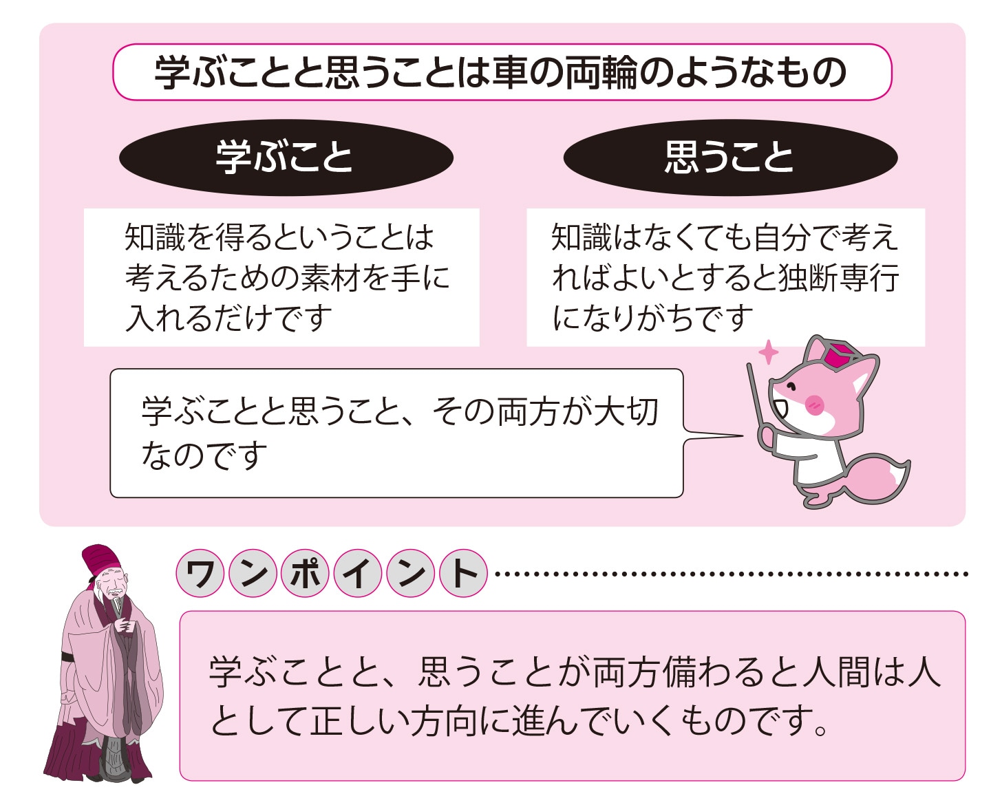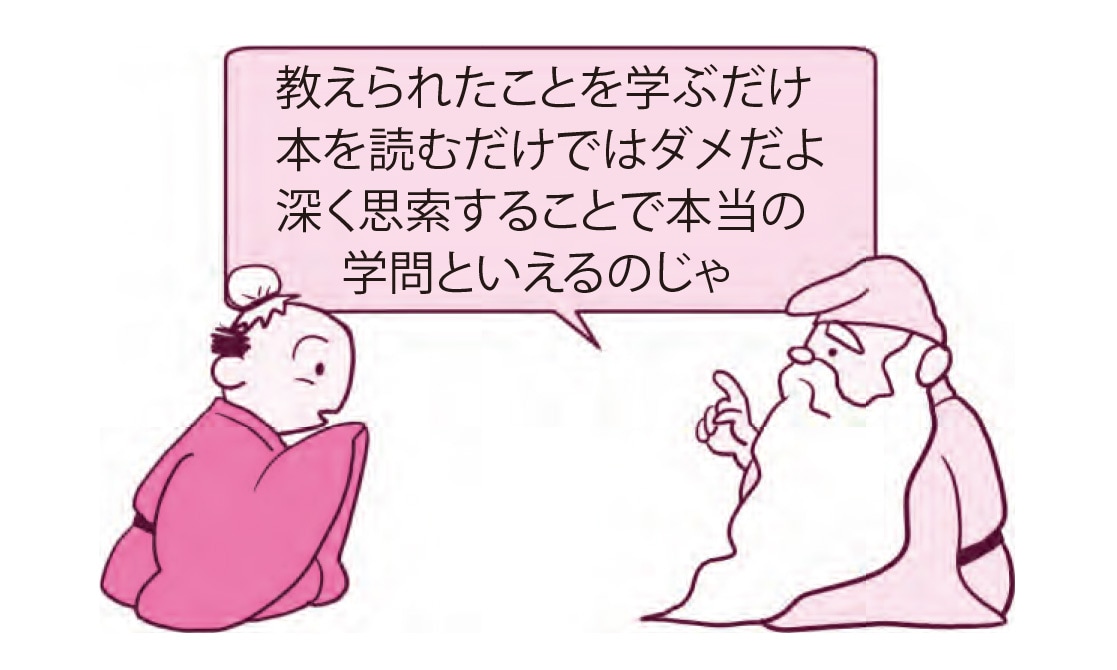 孔子が考える、学ぶということは、先生に教えてもらったり、本を読んだりすることだけではなく、さらに自分で考えて自分なりの考え方をもつことをいっています。どちらか一方だけでは、真の学問とはいわないのです。