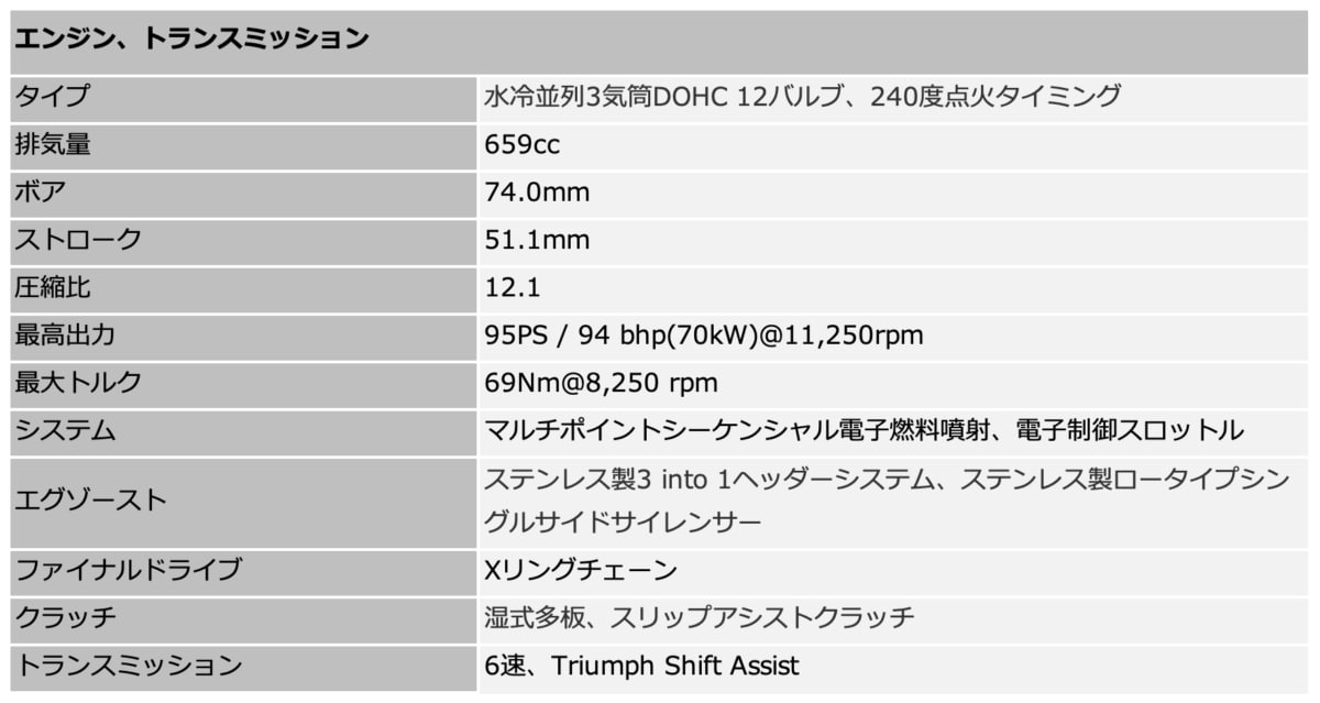 同モデルは、調整可能なShowa製フロントサスペンションやTriumph Shift Assistの標準装備、Metzeler M9RRタイヤの採用により、スポーツ性能を高めた仕様となる。あわせて3種類の新色を設定し、クリアアルマイト仕上げのアルミ製ブレーキペダルなど細部も刷新した。最高出力95PSを発揮する660cc3気筒エンジンや3種類のライディングモードなど従来の特徴も継承する。