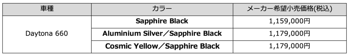 新型Daytona 660」はメーカー希望小売価格(税込)1,159,000円からの設定となります。「新型 Daytona 660」は全国のトライアンフの正規販売店にて予約注文可能です。店頭での販売(納車)は、2026年3月下旬を予定しています。