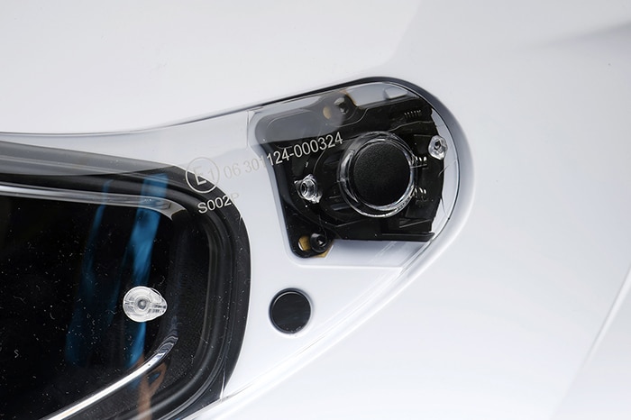 ヘルメットのシールドをワンタッチで着脱できる、クリックリリースV2機構を搭載。シールドをフルオープンにした状態で側面のボタンを押し、前方へスライドさせるだけで簡単に取り外すことができます。清掃やシールド交換もスピーディで、メンテナンス性に優れています。