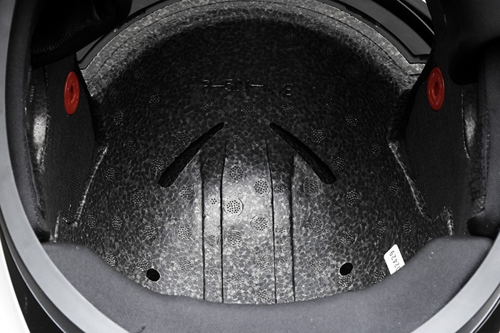 ABS樹脂製のシェルの内側には、密度の異なるEPS素材を組み合わせた多密度構造のライナーを採用。 衝撃の大きさや方向に応じてエネルギーを効率的に分散・吸収し、頭部への衝撃を効果的に軽減します。 LITHIUM CRFの高い安全性を支える重要な構造となっています。