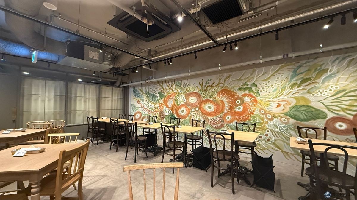 「1909 ユウリンショクドウ」に入ってまず目に入るのが、幅約6メートル・高さ約3メートルの壁画。いくらまりえ氏の「種の開く、」という作品で「種が眠り、芽吹く場所」をモチーフに制作。ここで食事をするひとときが、訪れる人にとっての特別になることを願って描かれています。