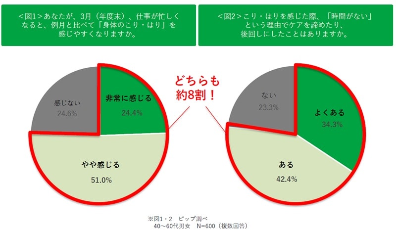 新年度を控え、3月は仕事・家庭ともに慌ただしさが増す時期。企業によっては決算や期末業務、異動・引き継ぎ対応などが重なり、個人でも生活環境の変化や将来への準備など、心身ともに負荷がかかりやすいタイミングだ。ピップ(大阪市)が今月、40~60代のこり症状がある男女600人を対象に「春」に関するインターネット調査を行ったところ、「3月は『身体のこり・はり』を感じやすくなる」と回答した人が約8割に上った。同社は、「3月病」的な身体の不調が存在している可能性があるとして注意を呼び掛けている。