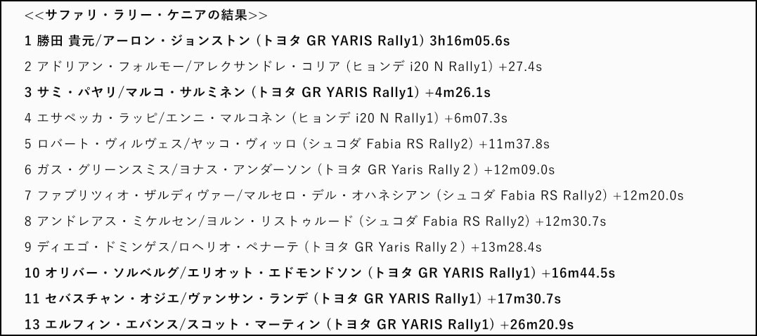 今回の勝田の勝利により、トヨタGAZOOレーシングワールドラリーチームはサファリ・ラリーが2021年にWRCのシリーズに復活してから負けなしの6連覇を達成。トヨタとしては通算14回目のサファリ・ラリー制覇となっている。