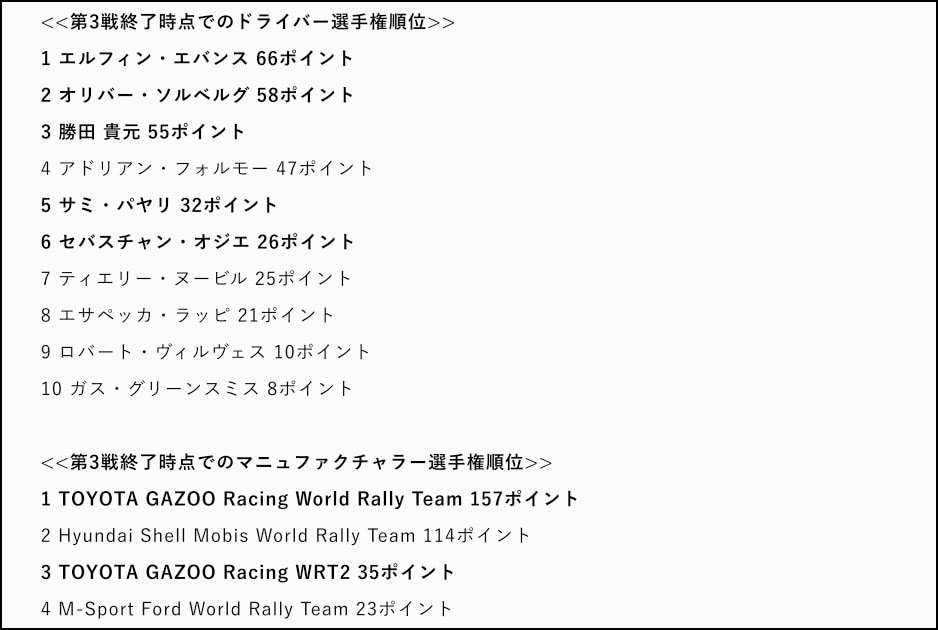 日本人ドライバーがWRCで総合優勝をしたのは、アフリカのラリー・コートジボワールを1991年と1992年に制した篠塚建次郎選手以来の快挙となる。