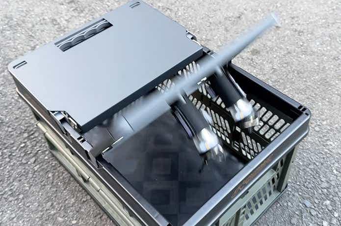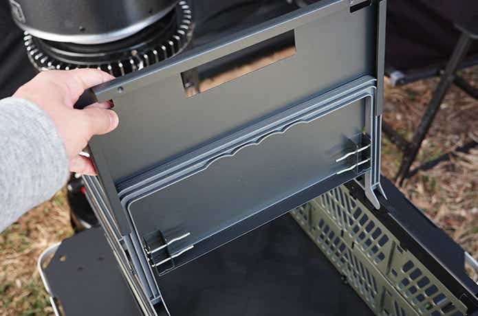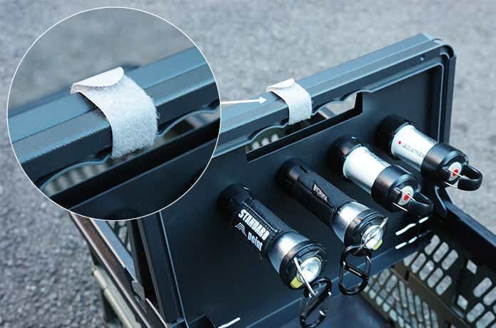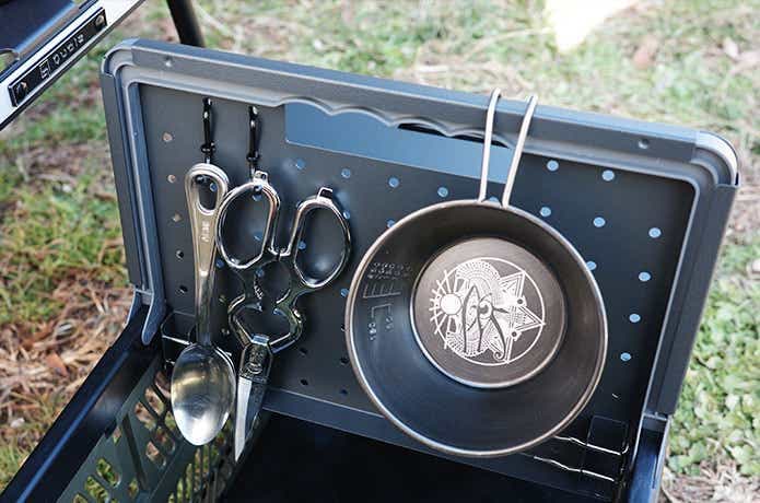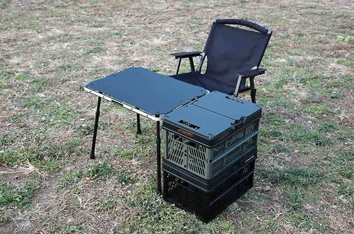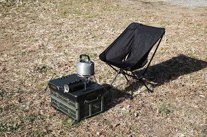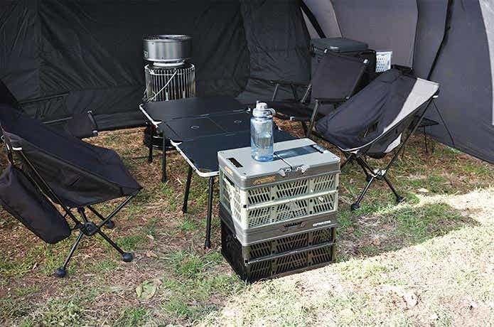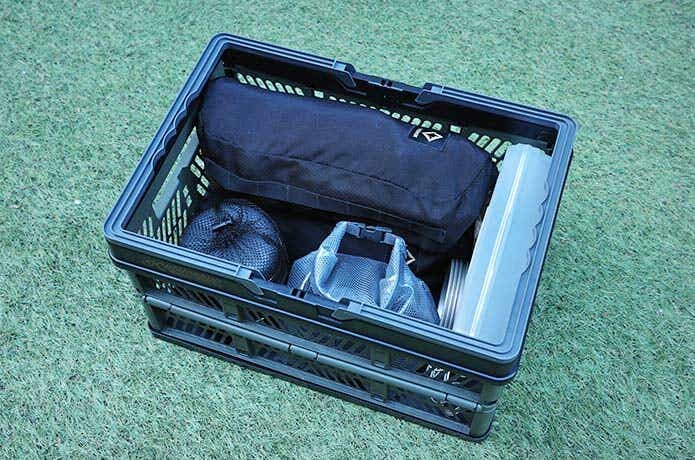 折りたたみコンテナはLサイズとあって収納力もあるのが特徴。キャンプ道具もチェアやバーナー、シェラカップなど小物を入れておくには十分なサイズ。