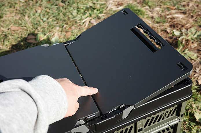 それが「Kumimoku 取っ手付き折りたたみコンテナ」のLサイズ専用オプション天板「トレーブル」。フタ兼テーブルとして使えるうえに、装着したまま折りたたみ、持ち運びもできる便利アイテムなんです。
