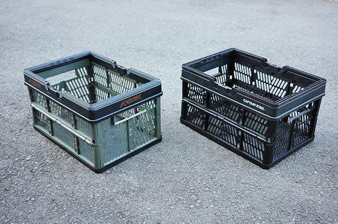(写真右)使用しているのは、キャプテンスタッグAmazon.co.jp限定カラーの「折りたたみコンテナ L」