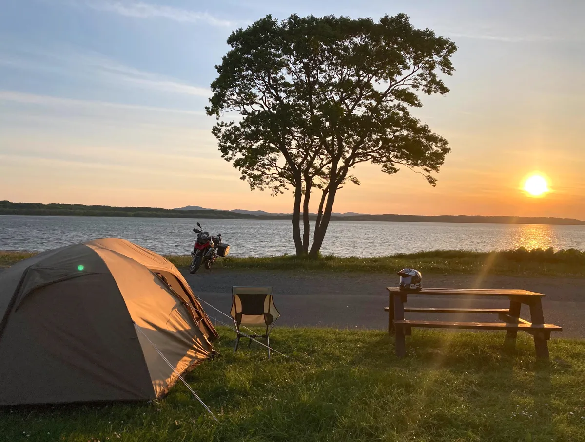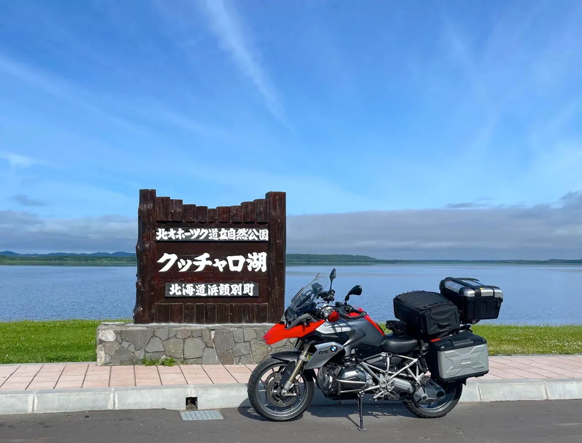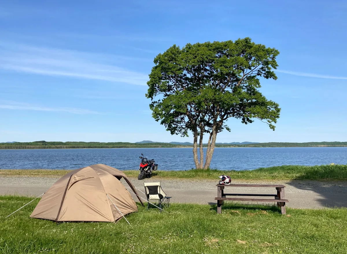ありったけの奇声を発しながらエサヌカ線を走り終えると、再び国道238号線に合流するので、さらに10分ほど走ると…数ある北海道のキャンプ場の中でもライダーに絶大な人気を誇る「クッチャロ湖畔キャンプ場」に辿り着きます。