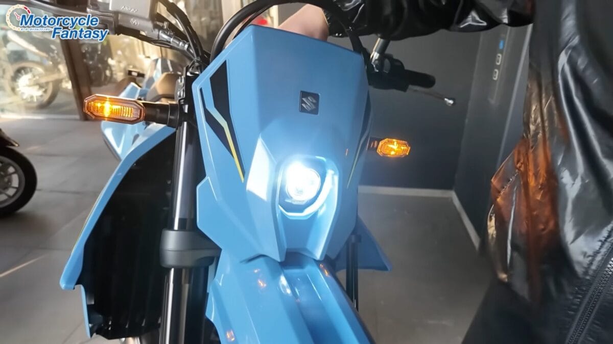 灯火類には現代的なデザインのヘッドライトを採用。コンパクトながら存在感のあるフロントフェイスを演出し、モタードらしいシャープなスタイリングを引き立てている。機能性とシンプルさを両立した装備構成が特徴だ。
