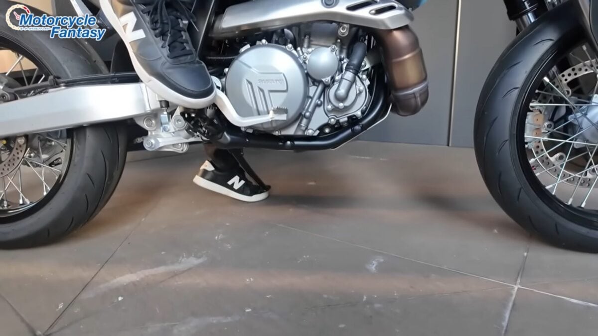 また、ドライサンプ方式を採用することでエンジンの搭載位置を低く設定でき、車体全体の重心を下げることが可能となった。これにより、モタードらしい軽快なハンドリングと安定したコーナリング性能を実現している。さらに排気バルブにはナトリウム封入タイプを採用し、高温になりやすい排気側の熱を効率よく逃がす構造を採用するなど、内部構造にも本格的な技術が投入されている。