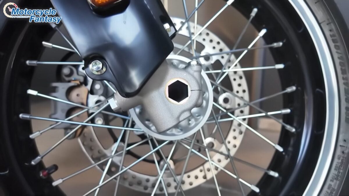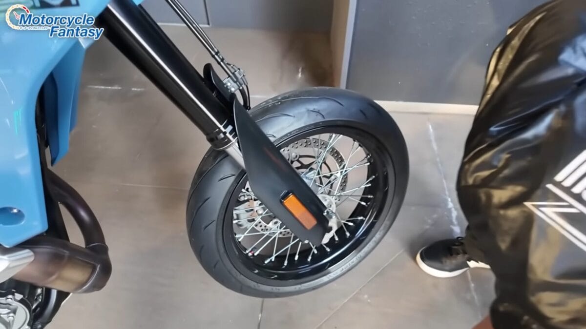足まわりは舗装路での走行性能を重視したモタード仕様。17インチホイールを装着し、ワインディングロードや市街地での俊敏なハンドリングを実現している。フロントには倒立フォークを採用し、高い剛性と安定した操縦性を確保している。