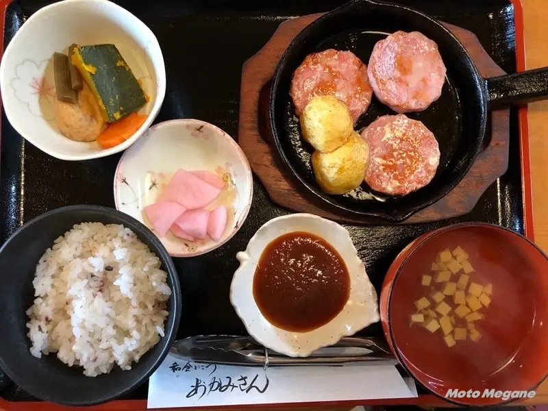 ご当地・明宝ハムを贅沢に厚切りにしてステーキに。喫茶明宝では№2の人気メニュー。和食処おかみさんでは、鉄板の上で香ばしく焼いて提供してくれる。そのまま食べるのとはまた違った味わいを楽しめる。おかみさんでは単品での注文も可能。
