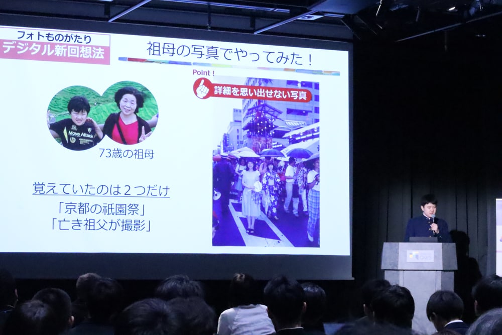 阿部さんは、AIを用いて1枚の写真から撮影当時の時代状況や天気、流行といった「思い出のかけら」(情報)を抽出し、それらの情報を組み合わせて、被写体が主人公の「物語」を生成するアプリを開発。軽度認知障害(MCI)患者などの認知機能の改善に役立つほか、結婚式や成人式、葬儀などでも活用できると紹介した。祖母ら協力者にアンケートなどを重ね、AI音声による読み上げ機能や生成AIとの対話機能などを追加していったほか、AIの検索先は安全なサイトに限定するなど倫理面にも配慮した。プレゼンテーションでは、「(AIの進化により)知識の記憶は不要。だからこそ思い出の記憶を大切にしていきたい」とアピールした。