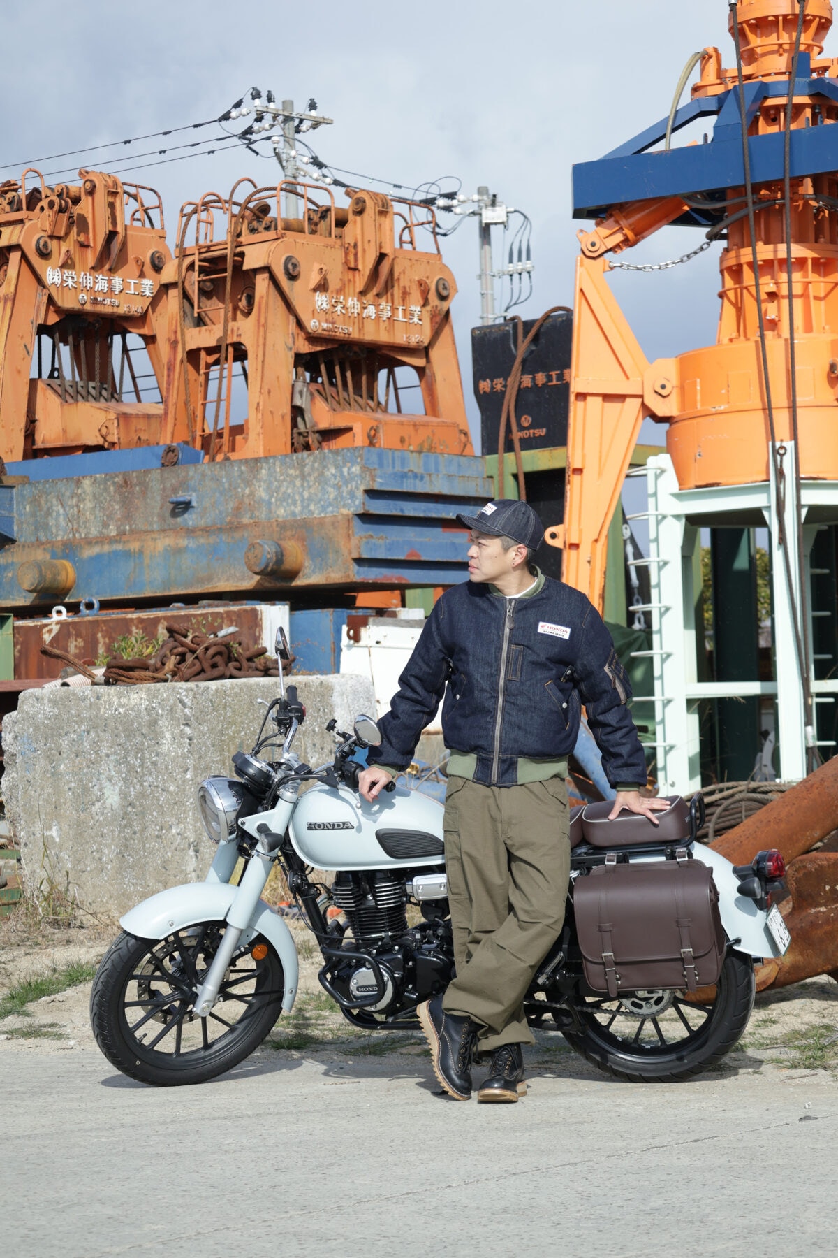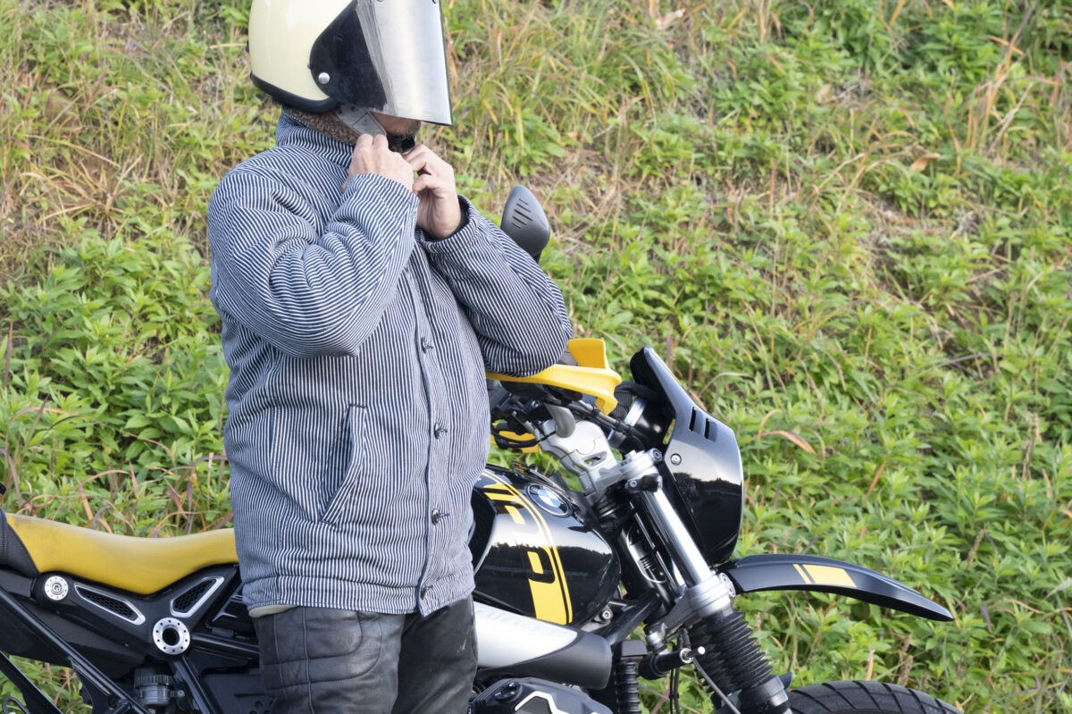 ホンダGBとの組み合わせもこれ以上ないほどぴったりハマりますね。こういうスタイルにはワークパンツやシンプルなミリタリーチノ、そしてブーツがよく似合います。もちろん、デニムジーンズとのセットアップもおすすめです。