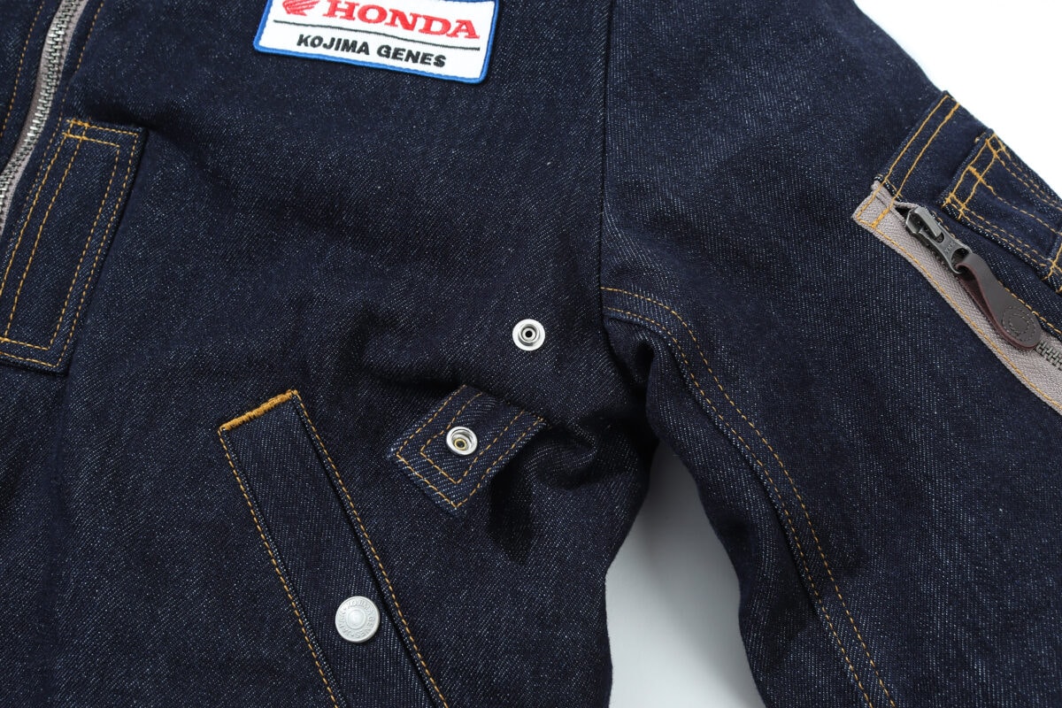 また胸元にはクラシックなワッペンをセット。ホンダロゴと児島ジーンズのロゴが入るワッペンは、昔のホンダ販売店のツナギにもありそうなデザイン! 長年着込んでいけば、デニムの経年変化を合わせて良い風合いを楽しませてくれそう。