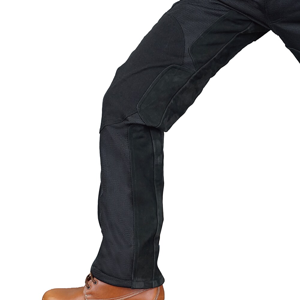 要所にヌバックレザーを採用したことにより、ニーグリップを向上させると共にエンジンの熱風からライダーの内股を守ります。バイク専用立体構造と着座部や転倒時の耐擦過性を考慮したヒップのヘビーコットン生地や、脚を大きく開き動きやすい股部分のストレッチ生地の採用など、酷暑もアクティブにライディングを楽しむライダー専用設計です。