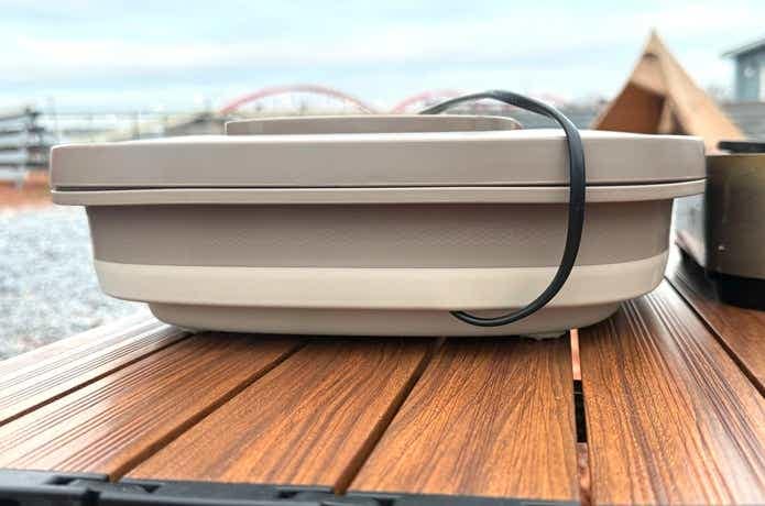 畳んだところを横から見ると、厚みはたったの10cm。見切れていますが、横に置いた一般的なカセットコンロとほとんど変わらぬ厚みです。