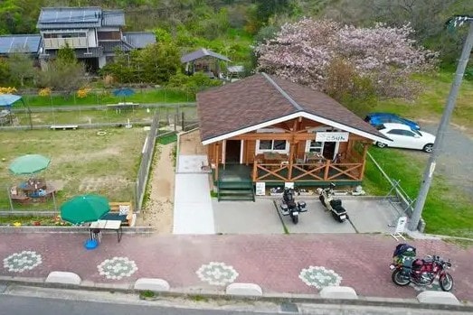 手作りログハウスの温もりと瀬戸内海の景色が魅力のライダーズカフェ。隣には2面のドッグランを備え、愛犬と一緒に過ごせるのも特徴だ。人気メニューは焼きカレーや自家製ワッフルなど、ツーリングの合間にしっかり食べられる料理がそろう。