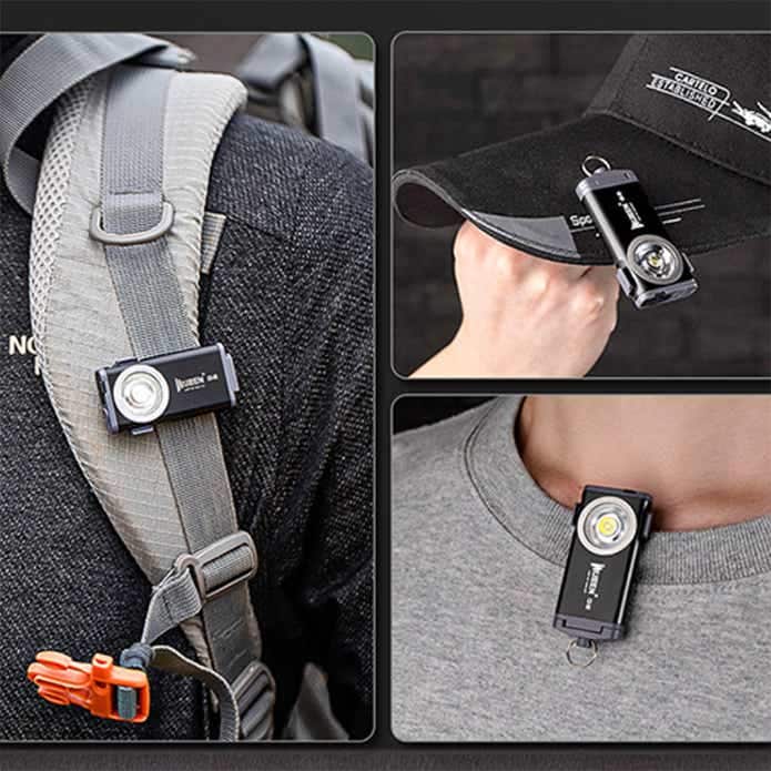付属のメタルクリップで帽子のツバなどに挟め、マグネット内蔵で金属製の場所にも装着可能。底面に脱着可能なマグネットベースやキーリングまで付属し、幅広い使い方が可能です。