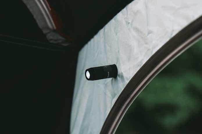 引き抜いたライト本体を、車や金属製ドアなどにくっつければ、ちょっとした作業もハンズフリーで行えます。薄手のテント生地なら、画像のようにキャップ部分と挟んで固定もアリ。