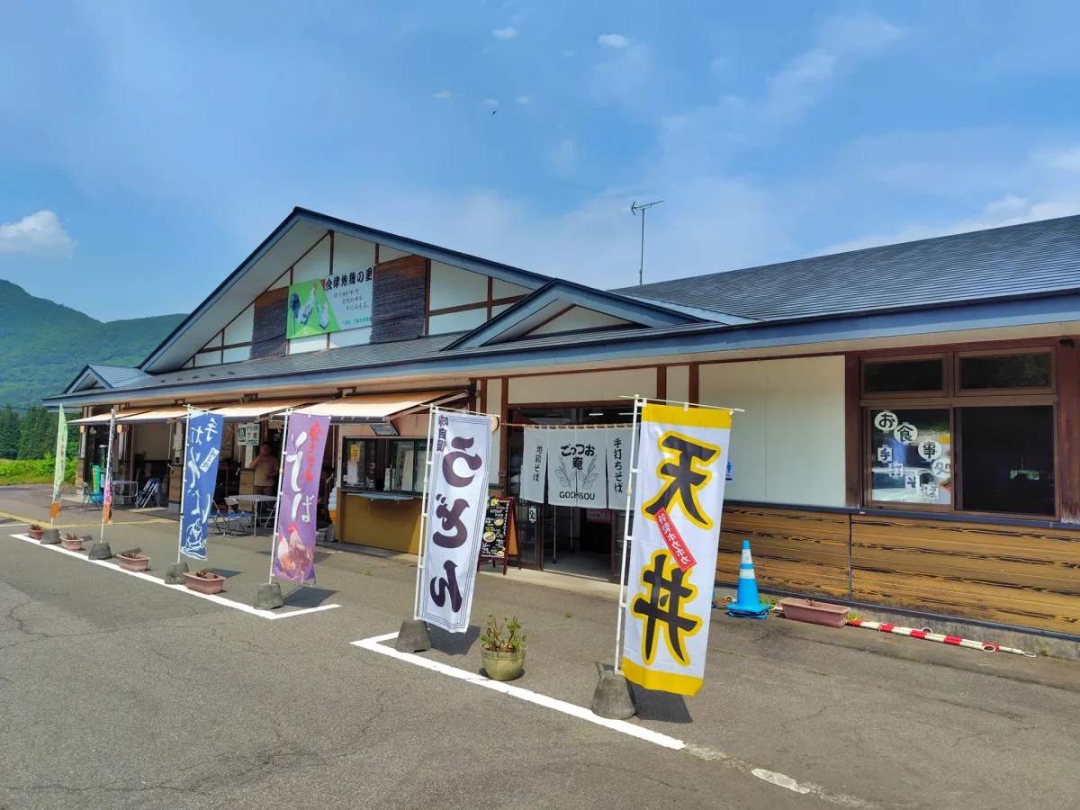会津へは天栄村の「鳳坂峠(ほうさかとうげ)」越えのルートを選択。延長約2.5kmの「鳳坂トンネル」で、あっというまに峠を越えて、下郷町へ。国道121号を会津田島方面へ南下して、どこでカソリさんを待つか、思案していたら、「下郷町物産館」が目に入ったので、ここで待つことにします。
