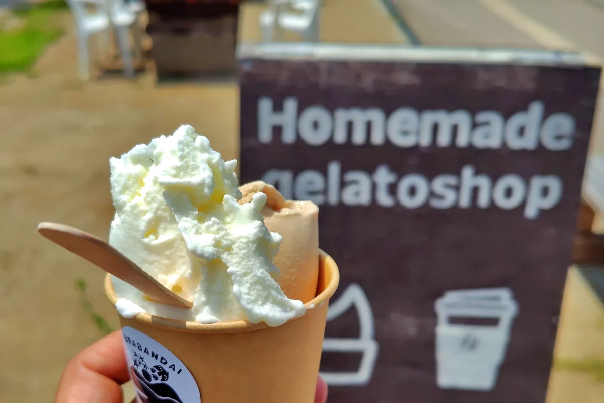 道を戻って、「道の駅裏磐梯」[ツーリングマップル東北 P.18(関東甲信越 P.103)H-3]に立ち寄ります。トイレ休憩だけの予定でしたが、カソリさんから特産品の「山塩」を使った料理をおすすめされたので、ここで昼食タイムとすることに。さらに、美味しいジェラートも味わって、元気満タンで、再スタートです。