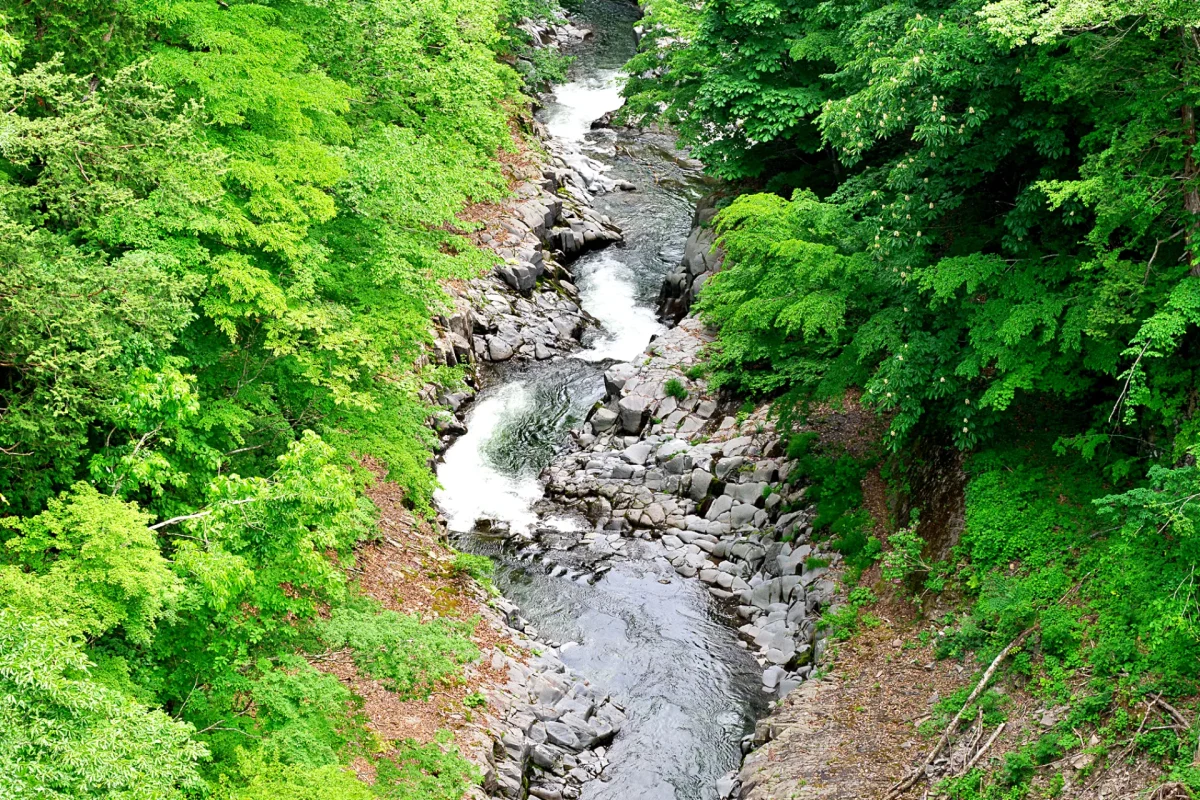 浄土平を出ると、すぐに荒涼とした岩場が広がる火山地帯で、さらに進むと「不動沢橋」です。目がくらみそうな深い渓谷にかかる、美しいアーチ橋で、眼下には福島の市街がちらりと見えました。