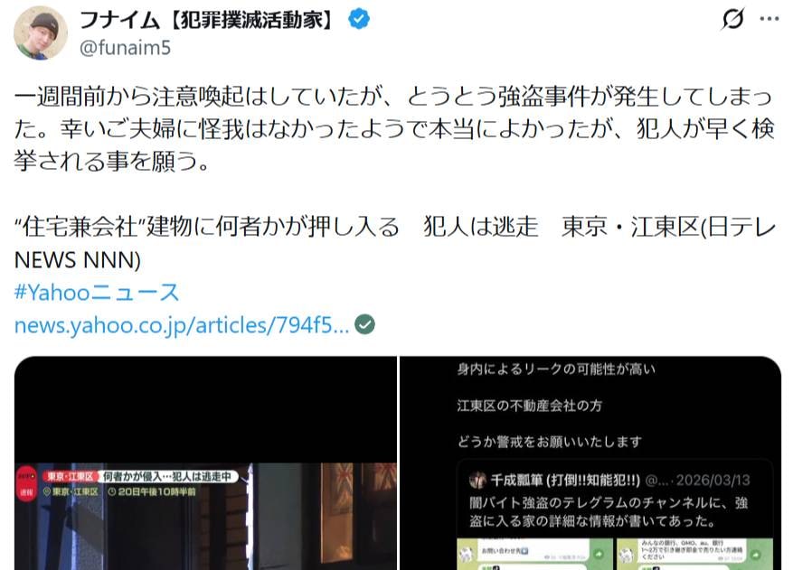 フナイムはすぐにこのポストを引用し、「闇バイトによる強盗予告か 東京都江東区の不動産会社」「詳細に金品の事が綴られているため身内によるリークの可能性が高い」「江東区の不動産会社の方どうか警戒をお願いいたします」と注意喚起していました。