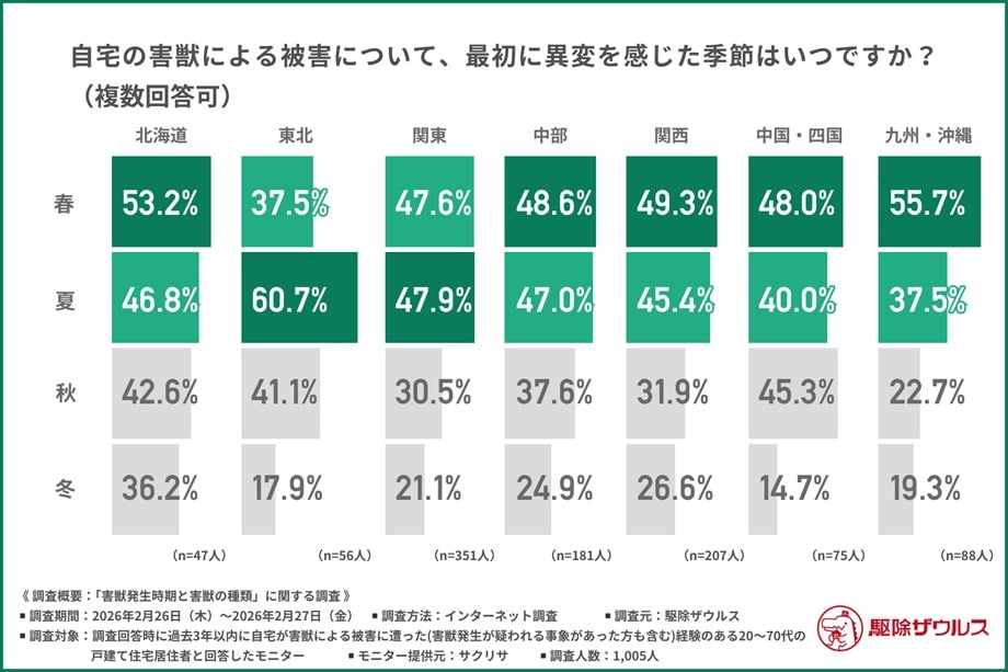 近年、クマによる被害が多発しているが、身近にいる小動物もヒトに害をおよぼすことがある。そうした中、害獣対策を行う駆除ザウルス(東京)は、過去3年以内に自宅が害獣による被害に遭った経験のある20〜70代の戸建て住宅居住者1005人を対象に「害獣発生時期と害獣の種類」に関する調査を行った。調査期間は2月26日~2月27日。