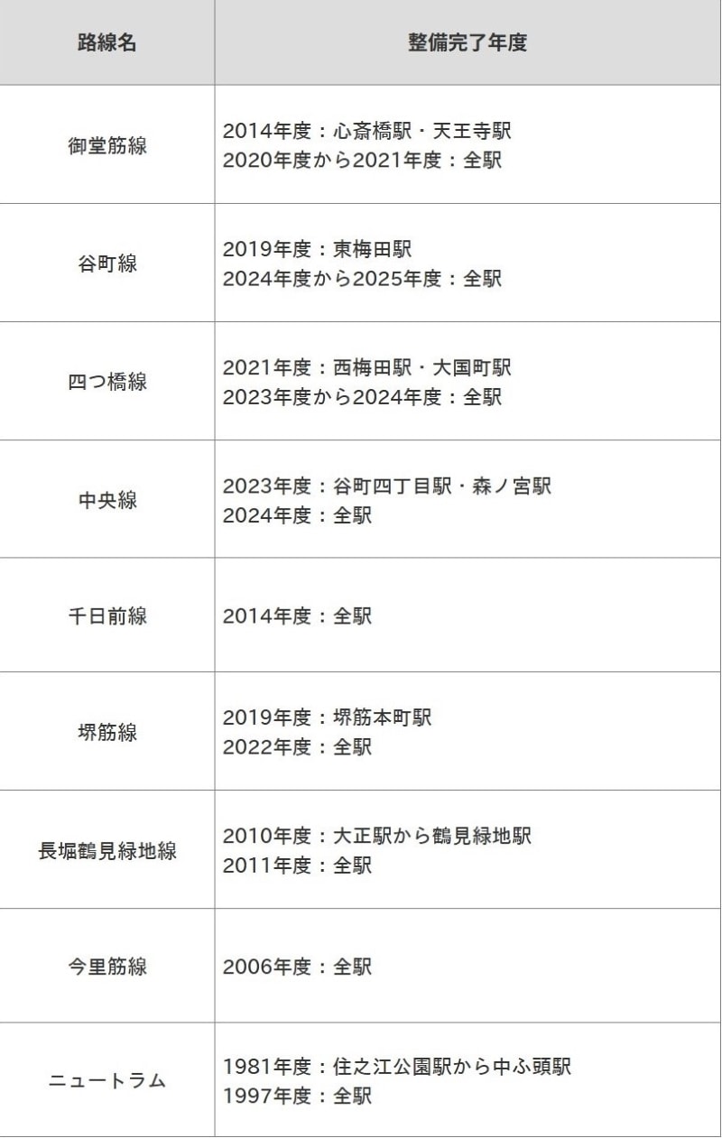 2006年に一気に全駅完了した今里筋線と、利用客が最も多く2014年の心斎橋・天王寺から足掛け8年かけて全駅設置した御堂筋線など。路線により整備のための時間は大きく差が出ました