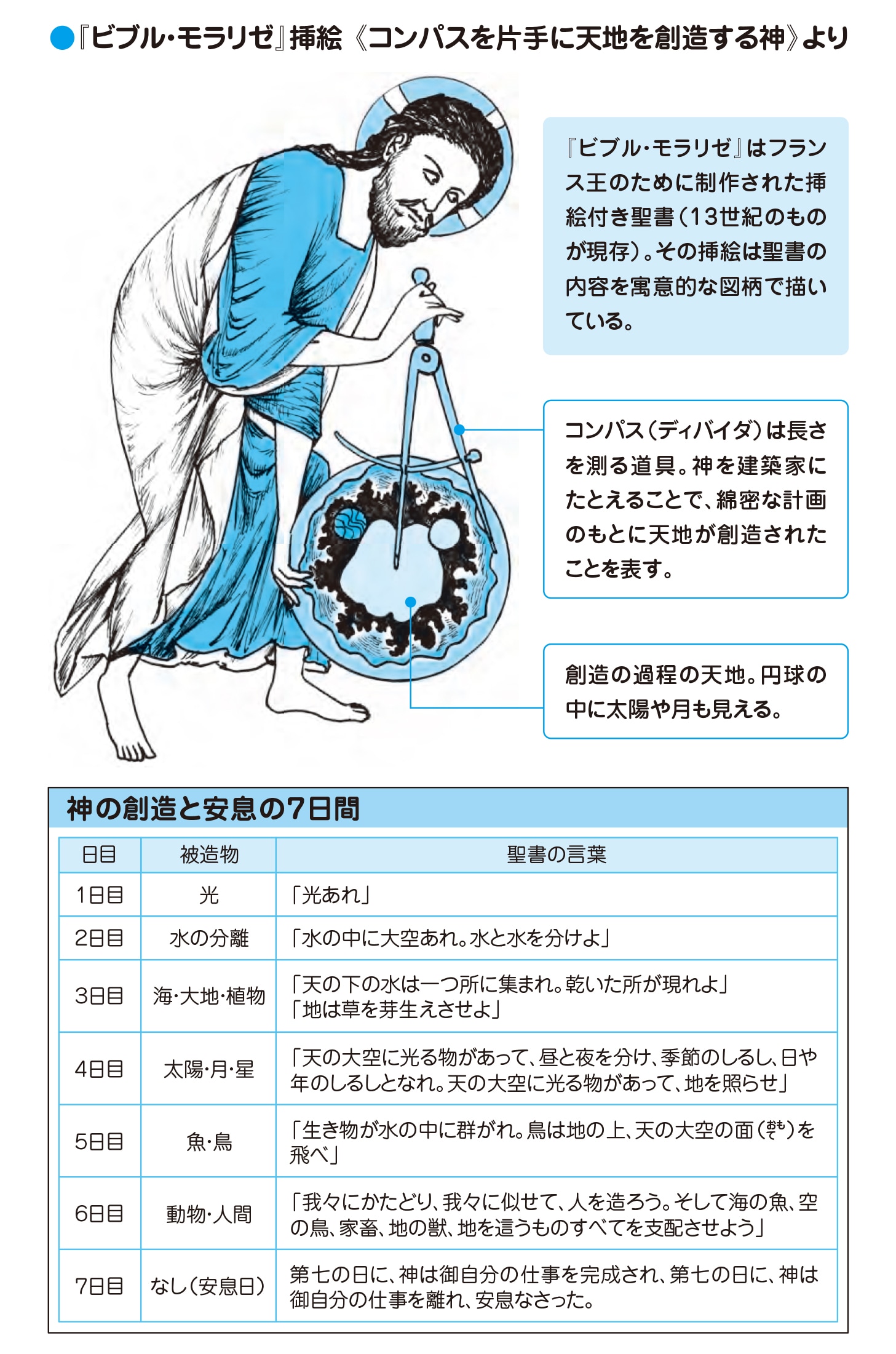 神は自分が造ったものをご覧になり、すべてに満足されたため、7日目は安息(あんそく)されました。神は第7日目を安息日として祝福し*聖別(せいべつ)されたのです。