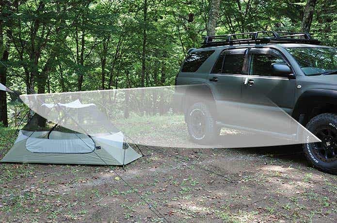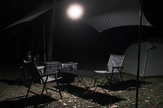 小さめのタープやテントであれば、メインランタンとしても十分な明るさ。写真のようにタープ下全体をしっかり照らせます。