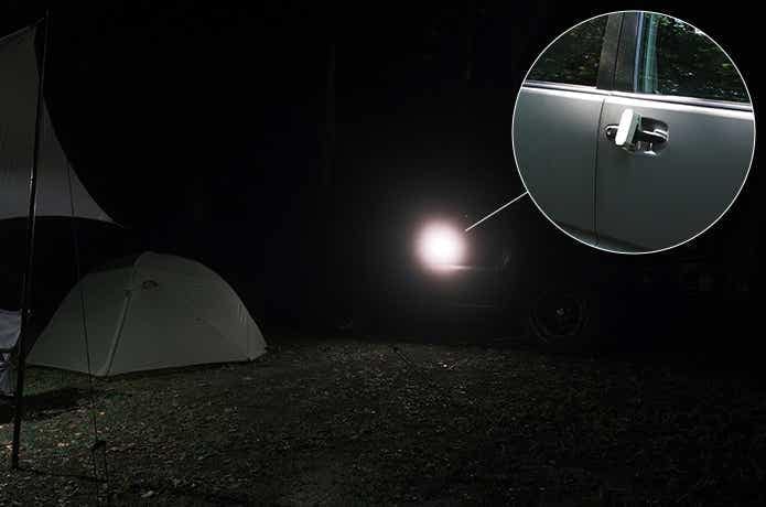 磁力の働くプレートを使ってテントの生地を挟むように固定したり、ポール部分に引っ掛けるのもおすすめ。テント周りは防犯的にも有効で、抑止効果が期待できます。