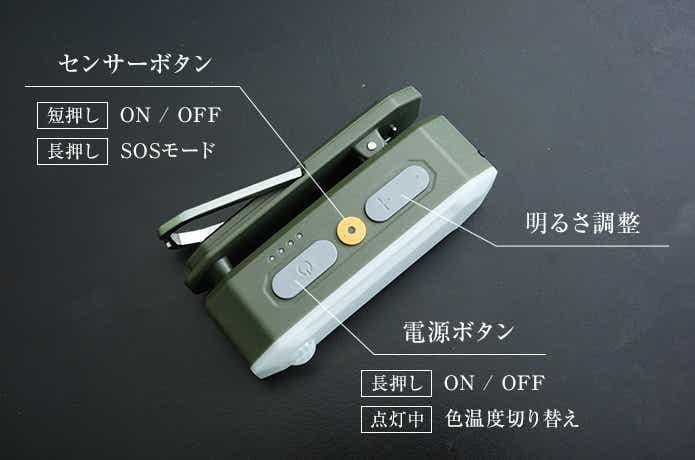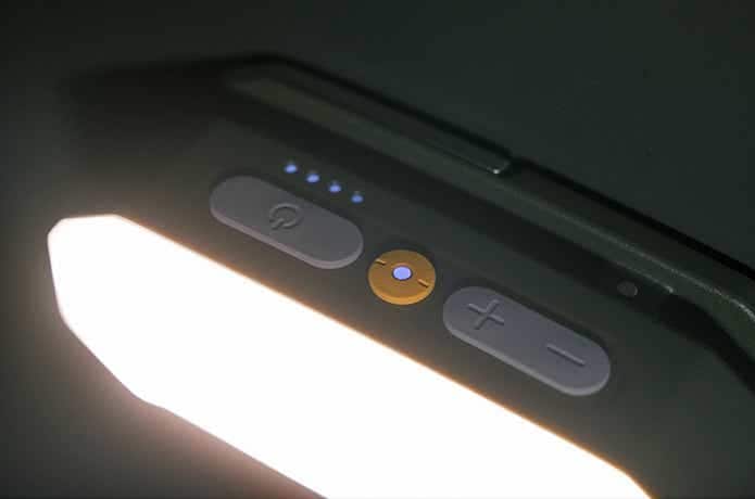 電源ボタンの長押しでON/OFF、点灯中に電源ボタンを押して色温度を切り替え、明るさは「+/ー」のボタンで調整可能と非常にわかりやすい構造です。