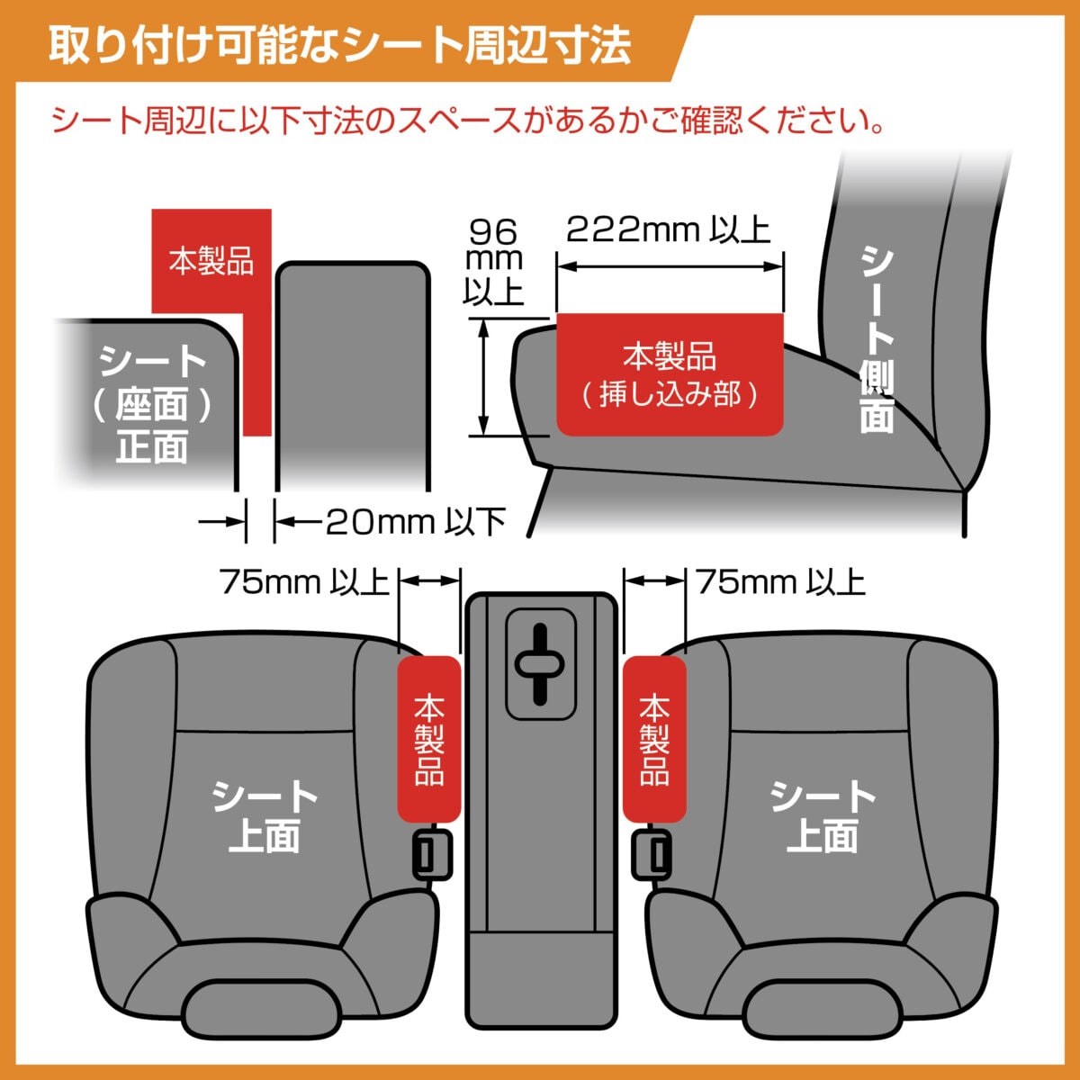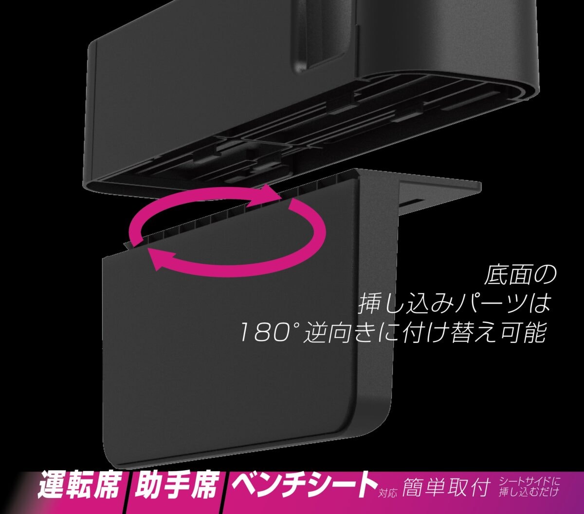 天面トレイはスライド式で、アームレスト装備車でも邪魔になりにくい設計。さらに、ケーブルを通しやすい穴とケーブルホルダー、レジ袋を掛けられるユーティリティーフックまで備えているので、収納だけでなく実用性の幅も広い。取付けはシートの間にアンカーパーツを差し込むだけで、位置調整も簡単。オープンプライスながら、日常使いのストレスを減らす機能が詰まったアイテムといえる。