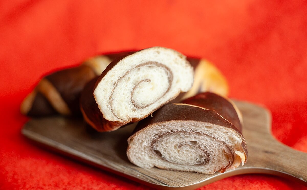 そして、半分に切ってみたのがこちら。ちょうど真ん中あたりを切ったのですが、場所がよくなかったらしい……。写真ではただ渦巻き状になっているだけですが、本当はたっぷりのチョコクリームが隠れているのでご安心ください。