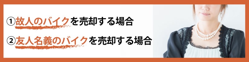 バイクの売却は、基本的に名義人本人がバイクショップなどに持ち込んで手続きするものですが、後述するケースのように他人名義のままで売却しなければならないこともあります。