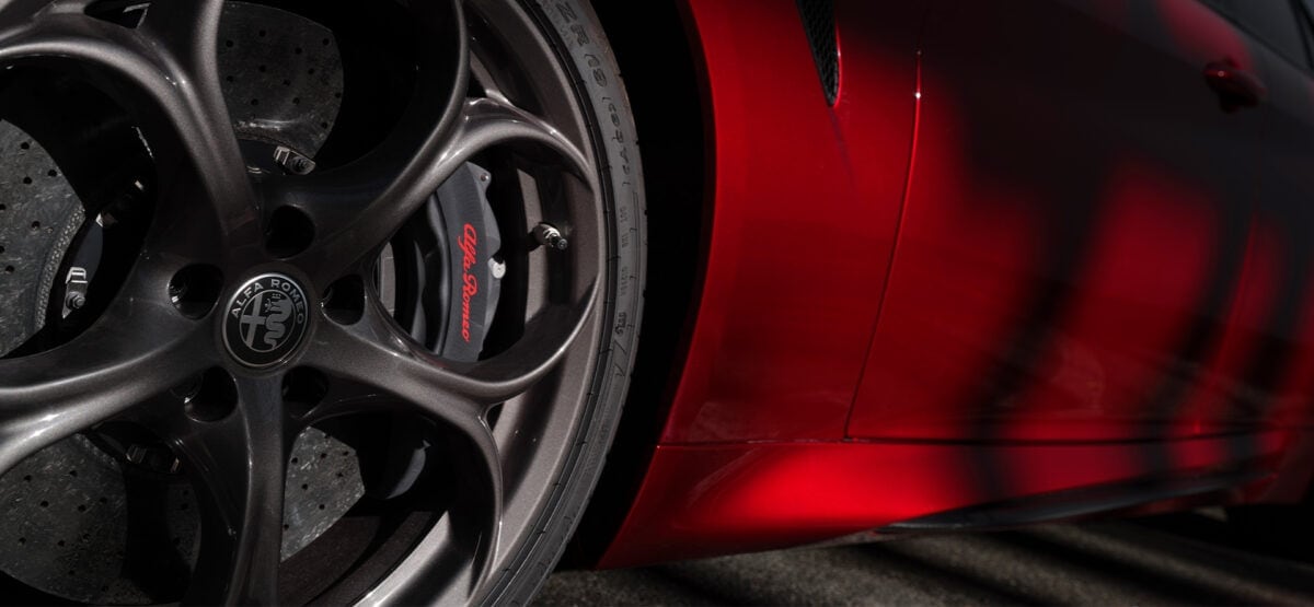 ブレーキキャリパーには、高い信頼性と優れた仕上げで知られるBrembo(ブレンボ)製のブラックのキャリパーを採用した上、特別なアノダイズド加工(アルマイト加工)を施し、赤いAlfa Romeoロゴを配しました。アノダイズド加工とは、アルミニウムの表面に強固な酸化皮膜を形成する処理であり、高い耐久性と放熱性を備えるレース由来の技術です。マット調ながら金属の質感を残す独特の仕上がりが、外装のカーボンパーツと調和し、精悍な印象をいっそう引き立てます。