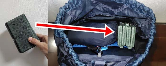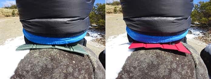 モンベルのほうが使用サイズが小さく薄いので、収納サイズも小さくなります。一方、重量は圧倒的に19gのダイソーのほうが軽量。とはいえ、モンベルのパッドも55gしかないので、携帯性という意味では五分五分でしょうか。