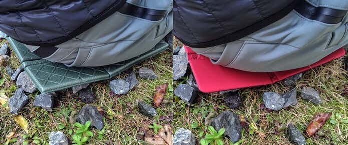 ダイソーのほうは、柔らかい素材なのでお尻に細かい突き上げを感じ、少々不快。一方、モンベルのほうは硬質ボードにより、凸凹感は感じるものの、細かい突き上げはあまり感じません。板の上に座っている感覚でした。