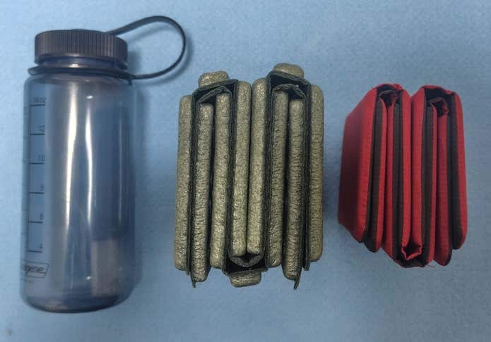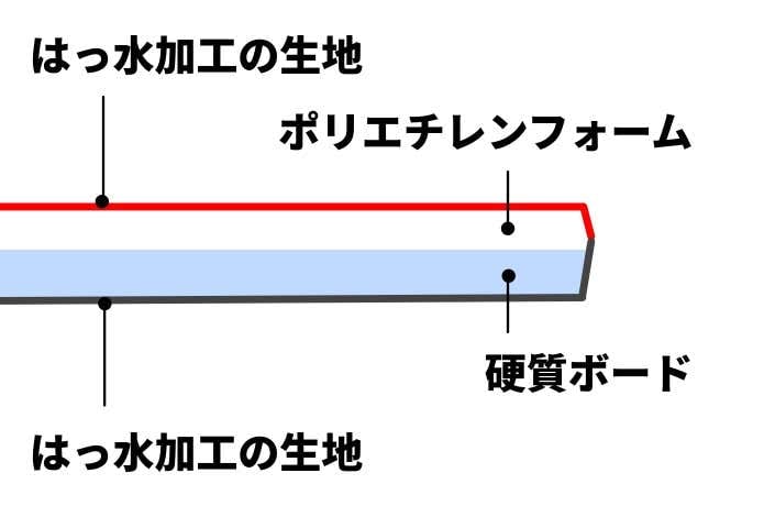 ダイソーのマットはポリエチレンのみの簡単な構造ですが、モンベルのパッドは上にクッション性を確保するポリエチレンフォーム、下に不整地での突き上げを軽減する硬質ボードを2層で配置。それらをはっ水生地で挟んだ構造です。