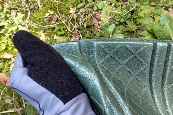 次に、ザラザラの岩の上でゴシゴシと思いっきり擦ってみました。裏を見てみると擦れ跡が残りましたが、致命傷になる感じではありません。